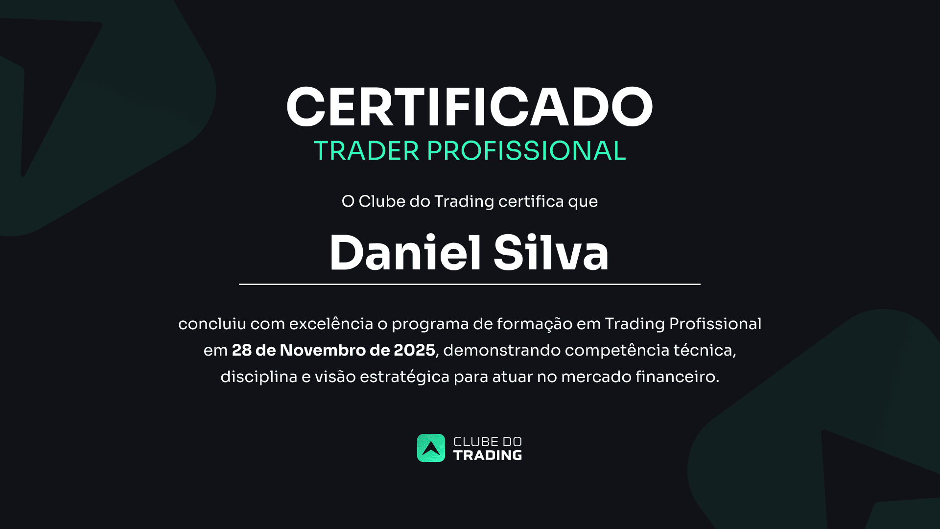Ao concluir o treinamento completo do Clube do Trading, você recebe um certificado oficial de Trader Profissional, comprovando que passou por uma formação sólida, com conteúdo aplicado e prática real de mercado.